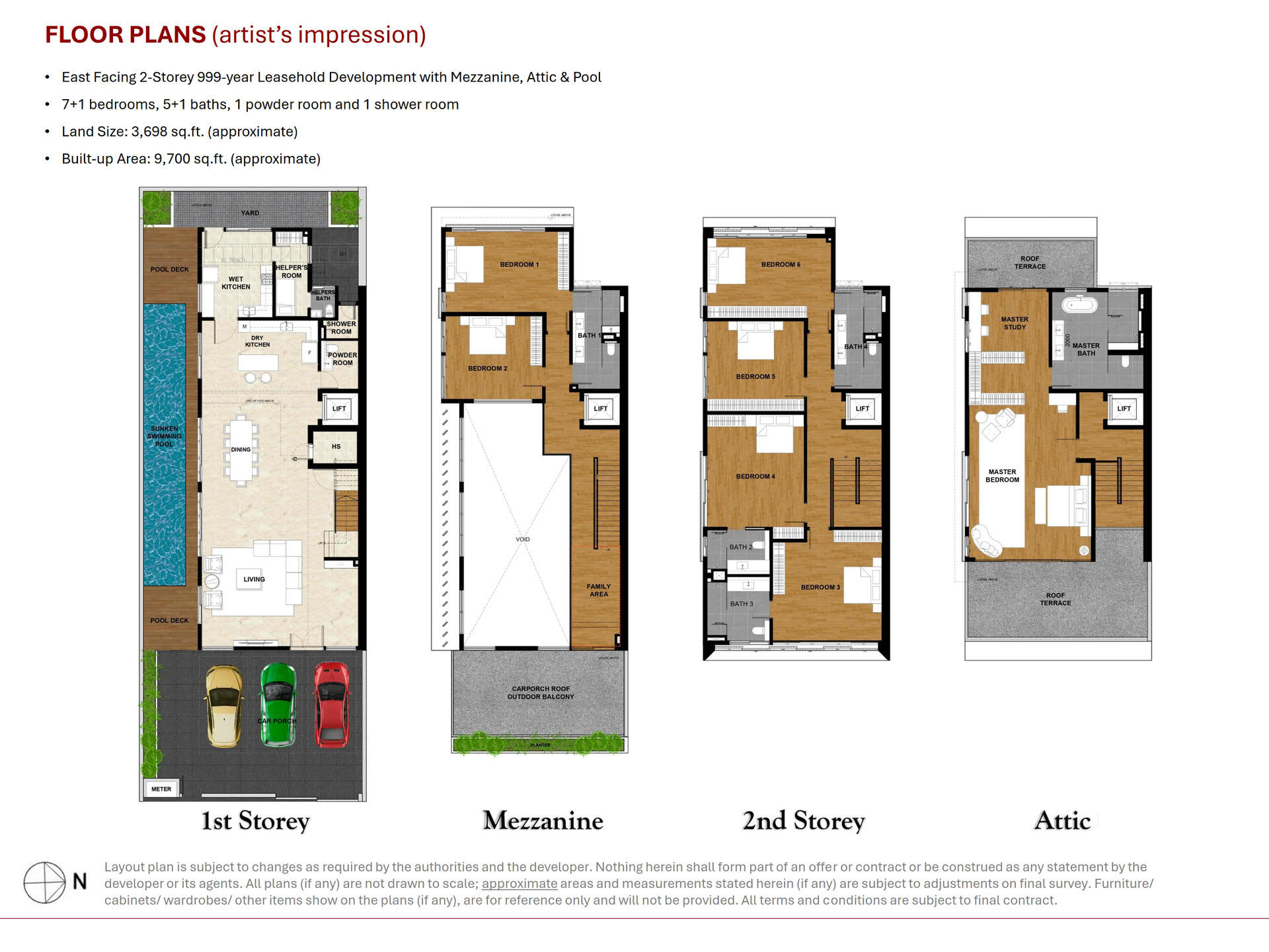 The attic storey crowns the home with a luxurious sanctuary exclusively for the master suite. This expansive level features a large master bedroom, a dedicated study area and space for a walk-in wardrobe. At the heart of this suite lies your master bathroom, featuring refined fittings, a freestanding bathtub and a glass-enclosed rain shower. A private roof terrace offers the perfect setting for serene morning yoga or quiet evenings under the stars.