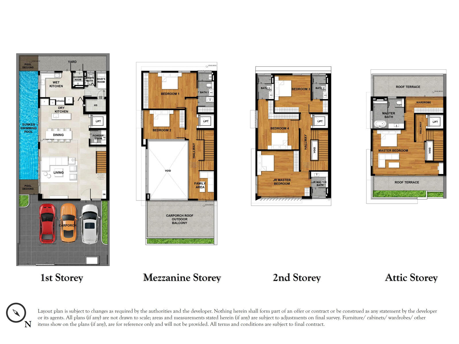 The mezzanine storey opens to the outdoor balcony on the car porch roof—perfect for patio lounging and weekend entertaining under the open sky. The second storey features 3 ensuite spacious bedrooms, including the junior master suite, with seamless access via a central hallway and lift.